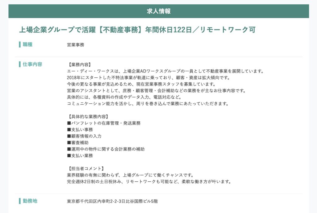ちなみに、下記は「リアルエステートWORKS」の求人になりますが、転職エージェントは非公開の求人も扱っていますし、業務の内容で気になったことがあれば企業に確認してもらえます。