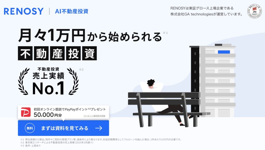 リノシー(RENOSY)は、東京商工リサーチによる不動産投資の売上実績が4年連続No.1のサービスです。(※東京商工リサーチによる不動産投資の売上実績(2025年3月調べ)不動産投資に強い「株式会社GA technologies」が提供しているブランドです。